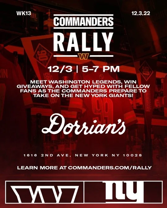 Washington Commanders Road Rally at Dorrian’s NYC! Saturday, December 3, 2022 4:00 PM 6:00 PM Dorrian's Red Hand 1616 2nd Ave. NYC (map) Google Calendar ICS
